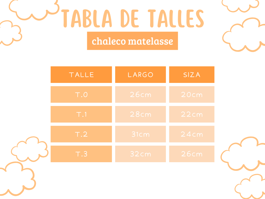 Podés utilizarla para comparar con las medidas de alguna prenda de tu bebé. Al tratarse de prendas con procesos manuales puede haber una mínima diferencia entre el producto y la tabla.